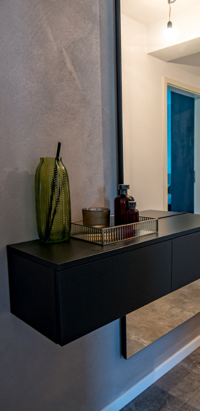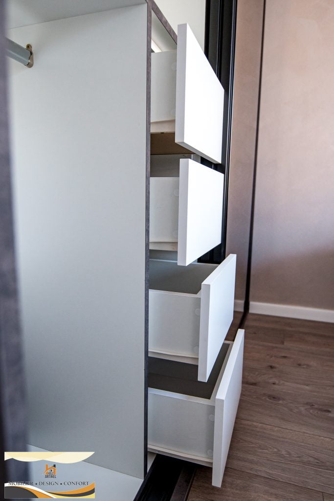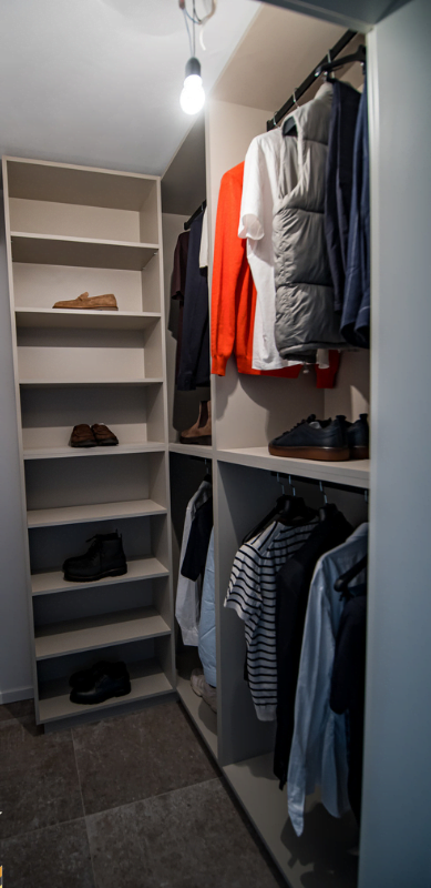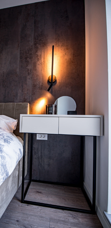 Dressingul, bine organizat și spațios, asigură o soluție ideală pentru depozitarea eficientă și accesibilă a hainelor și accesoriilor. Dormitorul, decorat într-un stil relaxant și rafinat, devine un refugiu perfect pentru odihnă și regenerare. Fiecare detaliu a fost atent ales și personalizat pentru a crea un ambient echilibrat și sofisticat, adaptat perfect nevoilor și preferințelor beneficiarilor.